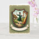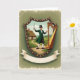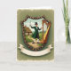This card shows a cheerful conductor standing inside a shield-shaped crest, smiling as he lifts a baton toward a gleaming golden harp, as if inviting someone close to share the music 💚. He wears an emerald green frock coat, a black top hat, and bright white breeches, and his open hand reaches outward like a friendly welcome. The harp’s curved frame and fine details catch the light, and the two figures sit side by side in a way that feels like an easy duet between friends. Behind them, rolling green hills lead to a thatched-roof cottage, with a winding dirt path that draws your eye through the scene under a soft blue sky with pale clouds ☘️. The shield border is trimmed with small golden studs that echo the harp’s shine and give the crest a ceremonial look. A cream banner flows beneath the shield, and the St. Patrick’s Day greeting is placed across the banner in green lettering. The background stays bright and pastoral, with the cottage tucked slightly left of center and the path curving gently toward it.
