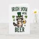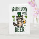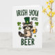 This greeting card features a cute cartoon raccoon centered on a white background, with masked eyes and a soft smile that feels like it’s meant for a close friend. It wears a deep emerald top hat topped with a shamrock, leaning slightly as if it’s posing for someone it trusts. One paw holds up a frothy mug of golden-amber beer, and the creamy foam is drawn thick and inviting. Dark green text sits above the raccoon reading “IRISH YOU WERE,” and the word “BEER” is placed below in the same rounded lettering. Small bright green shamrocks float around the character, adding a light St. Patrick’s Day touch ☘️. The raccoon’s striped tail curls to the side, giving the scene an easy, affectionate energy 💚. The hat’s shamrock is a crisp green shape set against the darker hat, and the mug’s pale foam contrasts with the warm beer color.