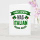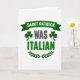 Conçu avec un fond blanc brillant, cette carte de la Saint-Patrick met en avant une déclaration malicieuse qui se lit « SAINT PATRICK ÉTAIT ITALIEN » en lignes empilées. « SAINT PATRICK » est placé au milieu sur une bannière ruban émeraude foncé, et les lettres sont blanches pour ressortir clairement. Juste en dessous, « ÉTAIT » apparaît en gris charbon, reliant discrètement la ligne supérieure au dernier mot comme une pause avant le punchline. Deux petits trèfles sont assis de part et d'autre de « ÉTAIT », colorés en vert riche avec un minuscule accent de croissant rouge qui fait référence à l'Italie et ajoute un clin d'œil charmant 💚. « ITALIEN » ancre la section inférieure dans un vert plus clair, donnant à la ligne inférieure un poids supplémentaire et faisant que la torsion se sent confiante. Une couronne de laurier vert foncé courbe autour du texte inférieur, ajoutant une touche classique qui peut ressembler à un toast intelligent partagé entre amis proches ☘️. La