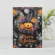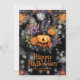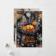 Photo Carte Halloween avec un jack-o'-lanterne portant un casquette de sorcière noir, des fleurs violettes et orange sur le devant et une photo à l'arrière. Personnalisez facilement cette jolie carte d'Halloween avec votre photo et le nom de famille.