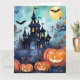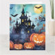 Joyeuse carte Halloween avec jack-o-lanternes éffrayant, la Lune, chauves-souris et une maison hantée sur le devant et un fantôme squelette avec un jack-o’lanterne à l’intérieur. Personnalisez facilement cette carte d'Halloween aquarelle avec votre nom de famille et votre texte.