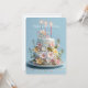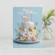 Jolie carte d'anniversaire avec un gâteau à deux couches, des bougies lumineuses et de beaux fleurs sauvages de sucre jaune, rose et blanc.