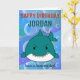 Fun Jawsome carte d'anniversaire avec un requin bleu et blanc nageant à travers des bulles et des algues dans une mer colorée. Sur l'avant et à l'intérieur sont des modèles pour ajouter votre propre nom et message ou supprimer pour laisser vide.