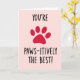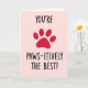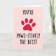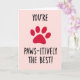 Célébrez la joie de la compagnie avec la carte « Vous êtes paws-itivement le meilleur ! ». Le devant présente une empreinte de patte mignonne accompagnée d'un message ludique, ce qui en fait la carte parfaite pour un amoureux des animaux ou quiconque qui remplit votre vie de plaisir et de rires.