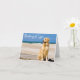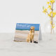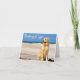 Cette carte de voeux amusante à base de canine présente l'image d'un beau chien de chiot jaune Golden Retriever assis sur une promenade en bois le long de l'océan avec un message de bienvenue "Pensez à vous" imprimé sur une police blanche et cursive surlignée du ciel bleu vif/