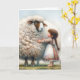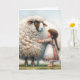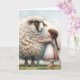 Une petite fille en robe à motifs admire un grand mouton avec une énorme toison moelleuse pour I Love You. Le texte est modifiable.