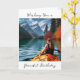Bonne carte d'anniversaire avec une belle scène sereine de kayak. Femme en kayak flottant sur le lac entourée de montagnes et de pins.