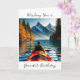 Bonne carte d'anniversaire avec une belle scène sereine de kayak. Un homme dans un kayak orange flottant sur le lac entouré de montagnes et de pins.