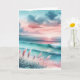 Carte d'anniversaire qui peut être personnalisée. Jolie scène de plage bleu pastel et rose. Des vagues océaniques sur le rivage sablonneux avec de délicates mauvaises herbes océaniques soufflant dans la brise par un jour nuageux au coucher du soleil.
