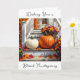 Une jolie carte avec des voeux et des bénédictions de Thanksgiving sincères. La couverture est illustrée d'une véranda avant de la ferme, ornée de mamans citrouilles et de feuilles d'automne, le jour de l'automne.