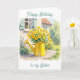 Une carte d'anniversaire très personnalisée pour une soeur. Une belle illustration de fleurs jaunes dans une canette d'arrosage jaune. Je vous souhaite un anniversaire paisible.