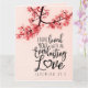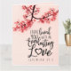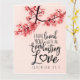 La carte de vœux avec citation inspirante représente une photographie de la nature d'une branche de fleurs roses sur un fond rose. Elle comporte une partie d'un verset biblique encourageant Jérémie 31:3, "Je t'ai aimé d'un amour éternel". Le vœu peut être personnalisé ou supprimé pour une note manuscrite et la carte utilisée pour de nombreuses occasions. Photo de Patrick Shaun.