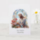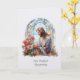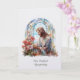 Cette élégante carte de condoléances personnalisée présente une image sereine en vitrail de Notre Seigneur Jésus admirant un délicat bouquet de fleurs sauvages. Réalisée dans des teintes pastel douces de bleu, de blanc et de rose, l'œuvre d'art évoque la paix, l'espoir et le doux souvenir lors des moments de perte.