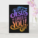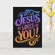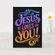 Ce design audacieux et inspirant présente le message « Jésus vous aime ! » dans une typographie saisissante d'inspiration vintage. Sur un fond noir profond, le lettrage s'anime avec un dégradé vibrant qui passe des bleus et des violets frais du haut aux oranges chauds et aux jaunes dorés du bas. Des fioritures élégantes et des volutes décoratives ajoutent une touche classique et artisanale, tandis que le contraste fort et la couleur radieuse donnent à l'ensemble une énergie moderne et accrocheuse. Le design global est à la fois intemporel et joyeux - parfait pour partager encouragement, foi et positivité.