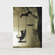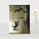 Le chat noir sur une oscillation d'arbre dans une soirée éffrayante joue avec les battes et les invitations de grouillement vous pour s'associer à la carte de voeux de Halloween