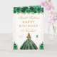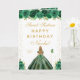 Cette carte d'anniversaire élégante et glamour pour un sweet sixteen peut être personnalisée avec un nom ou un titre tel que fille, petite-fille, nièce, amie, etc. Le design présente une belle princesse aux cheveux blonds et à la peau claire dans une robe de bal verte. Le texte combine une écriture manuscrite et des polices modernes sans serif pour un look classe et sophistiqué. Les arrangements floraux, les papillons et les confettis dorés créent le mélange parfait de rustique et de chic.