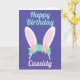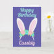 Belle carte d'anniversaire de lapin de Pâques pour une jolie fille qui aime les cartes mignonnes. Joyeux Anniversaire écrit en turquoise et un nom personnalisé en rose joli sur la carte cool violet.
