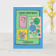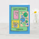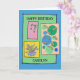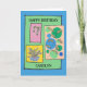 Cette carte de voeux d'anniversaire est décorée de trois jolis gribouillis de plantes, chacun à l'intérieur de sa propre frontière. Vous pouvez personnaliser la carte avec votre propre nom et votre salutation. Les couleurs principales du design sont le vert et le bleu, et l'intérieur est vide. L'oeuvre est composée de dessins multimédias originaux, et n'est disponible qu'à partir de L'Art d'être Beth.