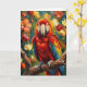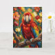 Une carte vierge sur laquelle vous pouvez écrire votre propre message. Sur le devant se trouve une peinture colorée de style impasto représentant un ara rouge, bleu et jaune ainsi que des fleurs.