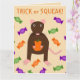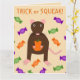 Cette carte incroyable présente une image graphique d'un petit rat brun mignon avec des oreilles, une queue et des pattes roses. Le rat tient une citrouille orange entre ses pattes. Il y a une collection de bonbons verts, violets et oranges entourant le petit rat. Ce design est parfait pour tout amateur ou propriétaire de rat pour Halloween.