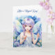 Une jolie fée aux cheveux tressés de lavande et ailes irisées tient une baguette papillon entourée de fleurs et de bulles.