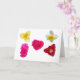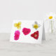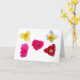 Une carte de vœux entièrement blanche, 5"x7", =facultatif, Horizontale=facultatif, pliée, avec une image d'une Tulipe Jaune, Jonquille Blanche et Jaune, Trois Roses Roses, Rose Rose #4, Une Tulipe Rouge, réduite ou agrandie, avec le fond supprimé, = (Photos de P.J.M.), sur le devant de la carte.