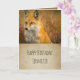 Carte d'anniversaire avec une belle photo d'un renard rouge en automne. Debout dehors au milieu de la brosse.