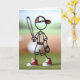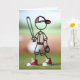 Un personnage en bonhomme bâton habillé en joueur de baseball se tient debout sur l'herbe verte d'un terrain de baseball, tenant une batte et un gant pour l'anniversaire baseball.