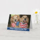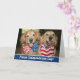 Joyeux 4 juillet ! Montrez votre esprit patriotique avec cette jolie carte de voeux dorée de récupération! Design propose deux chiens célébrant le Jour de l'Indépendance avec une cravate arc rouge, blanc et bleu et bandana.