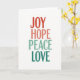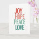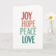 Spread holiday cheer with this charming Christmas card that is sure to brighten anyone's day! 🎅🏼🎄🎁 The card features a minimalist design with a powerful message, showcasing the words "JOY, HOPE, PEACE, LOVE" in bold, colorful typography on a clean white background. Each word is printed in a different color from a modern holiday palette, including burnt red, salmon, seafoam green, and deep teal. This simple yet striking design is perfect for sending warm, sincere, and contemporary holiday wishes to your loved ones. It's the perfect card to spread joy and goodwill this festive season! 🎄✨