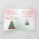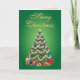 Un joyeux Noël doré au-dessus d'un sapin de Noël joliment décoré avec des cadeaux sur un arrière - plan vert foncé. À l'intérieur du sapin de Noël est répété sur le côté gauche et un graphique de bougie de Noël est sur le côté droit. Vous pouvez modifier ou ajouter du texte comme vous le souhaitez à l'intérieur de la carte.