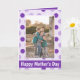 Carte de Fête des Mères mignonne, ce design affiche un arrière - plan motif à pois violet et lavande avec votre photo centrée. En dessous se trouve "Bonne Fête des Mères" écrit en joli caractère lavande. Il y a un message chaleureux à l'intérieur. Personnalisez cette carte de fête des mères aujourd'hui ! Photographie stock © Storytree Studios, Stanford, CA Oeuvre d'art créée par : AMBillustrations http://www.etsy.com/shop/AMBillustrations/