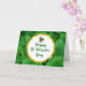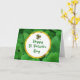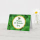 Une carte de vœux qui dit Joyeuse Saint-Patrick avec une photo de fond d'un champ avec des trèfles verts. Un cadre circulaire avec une bordure en feuille d'or FAUX contient le texte écrit dans une police tendance et contient une illustration de trèfle vert. message à l'intérieur de la carte que vous pouvez personnaliser.