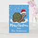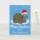 Souhaitez un Joyeux Noël avec cette mignonne tortue de dessin animé portant un chapeau de Père Noël rouge et blanc debout dans la neige. Vous trouverez ci-dessous un modèle pour ajouter votre nom de famille à personnaliser.