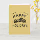 Carte de Noël moto avec un design rétro représentant une silhouette de moto avec les mots Joyeuses Fêtes dans des polices vintage et des étoiles au-dessus, le tout en noir sur un fond or pâle. Le texte intérieur "Profitez de la balade" peut être modifié si vous le souhaitez. Vœux de fêtes à l'ancienne pour amis motards.