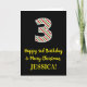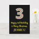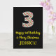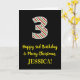 La façade de cette carte de voeux amusante et simple sur le thème de Noël et d'anniversaire du 25 décembre présente un grand numéro "3", avec un motif à rayures rouge/blanc/vert. Il comporte également le message "Joyeux 3e anniversaire & Joyeux Noël", et un nom personnalisé. L'arrière - plan du devant est noir de couleur. L'intérieur comporte un message de voeux d'anniversaire personnalisable, ou peut-être pourrait-il être effacé et laissé vide si un message doit être écrit à la main à la place. Une carte d'anniversaire comme celle-ci peut être une façon amusante d'envoyer des voeux d'anniversaire à quelqu'un qui célèbre son troisième anniversaire et qui est également né le 25 décembre (jour de Noël). [~Z0000405]