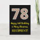 Le recto de cette carte de voeux amusante et simple sur le thème de Noël et d'anniversaire du 25 décembre comprend un grand numéro "78" avec un motif à rayures vert/blanc/rouge, ainsi que le message "Happy 78th Birthday & Joyeux Noël", et un nom personnalisable. L'arrière - plan du devant est noir de couleur. L'intérieur comporte un message d'anniversaire personnalisé, ou pourrait être effacé et laissé vide si un message doit être écrit à la main à la place. Une carte d’anniversaire personnalisée comme celle-ci pourrait être une façon amusante d’envoyer un message pour célébrer le soixante-dix-huitième anniversaire de quelqu’un qui tombe aussi le jour de Noël (le 25 décembre). [~Z0000405]