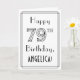 L'avant de cette luxueuse carte de voeux Art déco des Années folles est ornée du message "Joyeux 79e anniversaire", accompagné d'un nom de destinataire personnalisé. Le numéro "79ème" sur le devant a un look soigné doublé, et il y a aussi une frontière multi-lignes. L'intérieur a un message de voeux d'anniversaire personnalisable, ou peut-être peut-être être effacé et laissé vide si un message doit être écrit à la main à la place. Une carte de voeux élégante et personnalisable comme celle-ci pourrait être envoyée pour célébrer le soixante-dix-neuvième anniversaire de quelqu’un. [~Z0000641]