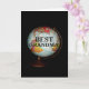 Un globe aux couleurs vives, photographié contre un arrière - plan noir, fait l'objet de ma carte d'anniversaire "Joyeux anniversaire à la meilleure grand-mère sur terre !". "Meilleure grand-mère" en texte noir sur la face du globe complète l'image avant de la carte.