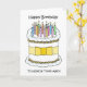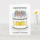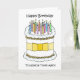 Illustration d'un grand gâteau d'anniversaire blanc recouvert de bougies éclairées et accompagné des mots "Joyeux anniversaire à un agent de voyage spécial".