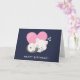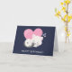 Carte d'anniversaire avec une illustration graphique adorable. Un chaton blanc avec une image de l'empreinte de patte mignonne sur sa fourrure. Dormant paisiblement. Un gros cœur rose derrière elle et quelques petites étoiles aussi. Fond bleu foncé.