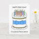Illustration d'un grand gâteau d'anniversaire blanc recouvert de bougies allumées et accompagné des mots "Joyeux anniversaire à un officier de police spécial".