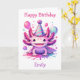 Carte d'anniversaire personnalisée rose et violet avec un axolotl mignon avec un casquette d'anniversaire et des ballons. À l'intérieur de la carte se trouve une page de coloriage. Mignonne pour toute petite fille qui aime les axolotls !