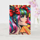 Fille d'art pop comique colorée avec des cheveux colorés, du rouge à lèvres rouge et des rubans dans ses nattes,