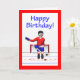 Carte d'anniversaire avec mon oeuvre numérique d'un joueur de hockey debout dans une patinoire prête à commencer une partie de hockey. Le texte dit "Joyeux anniversaire !"