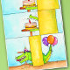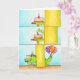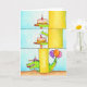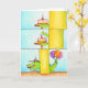 Cette carte se décline en trois vignettes de dessin animé. La première montre un pilier jaune sur un fond bleu ciel. À gauche du pilier, un gâteau est posé sur une petite table. Le gâteau est fait de génoise jaune, avec une garniture au chocolat et un glaçage rose. Une bougie d'anniversaire rouge est allumée dessus. Une petite mâchoire inférieure verte s'étend derrière le pilier en direction du gâteau. Dans la deuxième vignette, la mâchoire supérieure claque vers la mâchoire inférieure. Elle va claquer sur le gâteau.