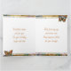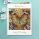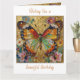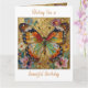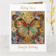 Une jolie carte souhaitant un joyeux anniversaire à une amie ou un membre féminin de la famille avec une illustration de devant d'un beau papillon or, sarcelle et orange entouré de fleurs jaunes, blanches et violettes. C'est fait dans un style impasto et dégage juste de la beauté et de la grâce. À l'intérieur se trouve un beau poème sur les anniversaires et les papillons.