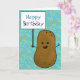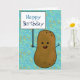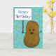 Jolie patate de dessin animé marron heureuse avec un grand sourire sur son visage. Il tient un panneau avec un modèle de texte indiquant Joyeux Anniversaire. Changez la couleur de fond en cliquant sur personnaliser.