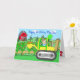 Cette carte mignonne dessinée à la main, présente un petit garçon conduisant un tracteur avec un thème général de garçon comprenant des outils, des tracteurs, des camions et des voitures.
