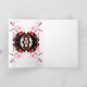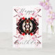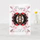 Sur le devant de la carte, un motif abstrait de fleurs est présenté en rouge et noir sur un arrière - plan blanc, avec "Joyeux anniversaire" en lettres noires superposées. Le rabat intérieur gauche/haut a la même image sans mots, avec le rabat intérieur droit/bas blanc en blanc, en attente de votre message personnalisé.